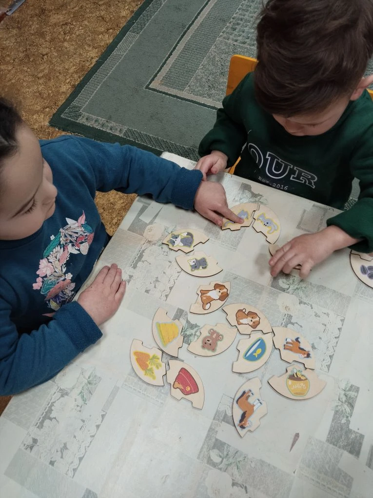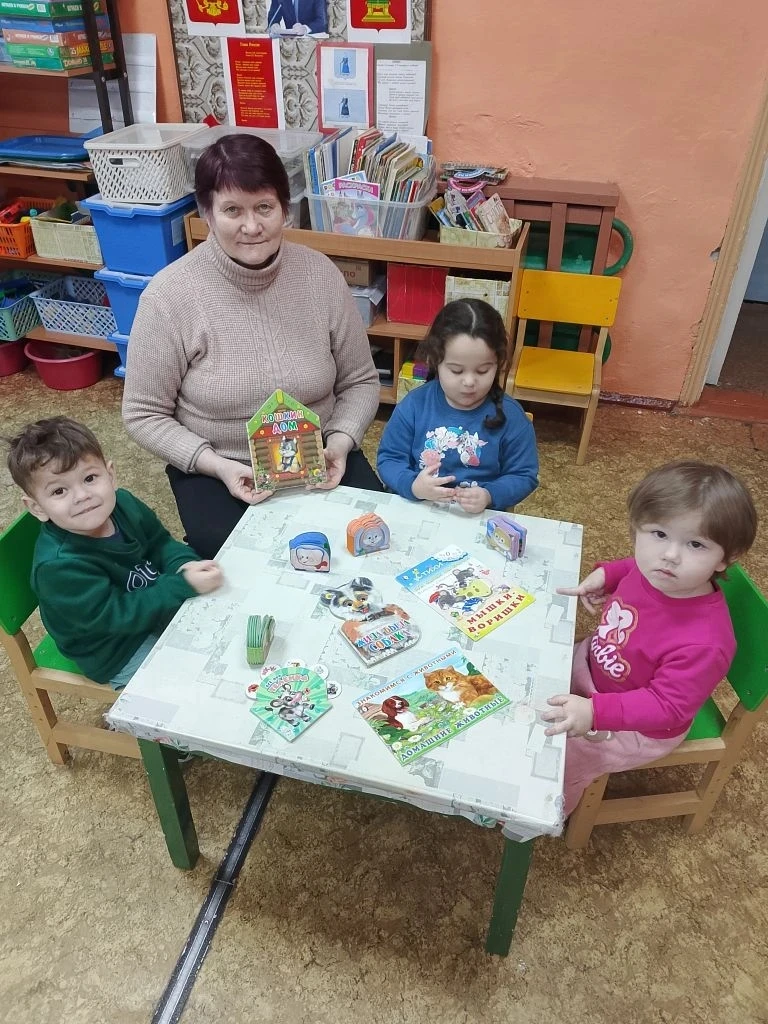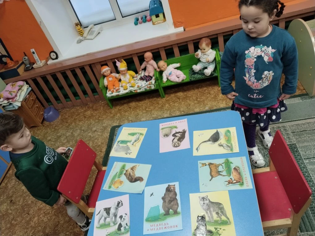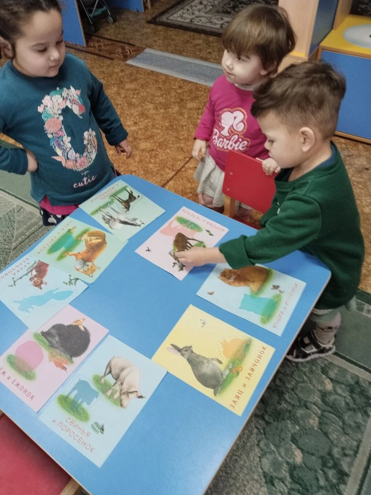 В младшей группе филиала прошла интересная тематическая неделя -«Дикие и домашние животные». Воспитанники закрепили знания о домашних животных и обитателях леса, полученные на занятиях и в совместной деятельности. Ребята учились узнавать животных на картинках и называть их, выделять отличительные признаки животных леса и домашних животных, закрепили способ рисования –раскрашивание контурного рисунка. Дети подробно познакомились с внешними особенностями и повадками зайца и кошки . Помогли им в этом дидактические игры : «Зайчик и белочка», «Угадай-ка!», «Накорми кошечку и собачку»; подвижные игры «Зайка беленький сидит», «Догони кошечку». В гости к ребятам приходила библиотекарь Федорова Марина Сергеевна. Она познакомила ребят с красочными книжками –малышками про животных. Провела с ребятами игру «Кто где живет?». Неделя закончилась поездкой в зимний лес на день рождения зайчика. Дети с зайчиком танцевали, играли. Зайчик научил ребят умываться , послушал песенку про себя, а дети подарили лесному зверюшке пирог , украшенный малиной, ежевикой, грибами и цветами. Все вместе исполнили песню «Каравай» и поздравили зайку с днем рождения.