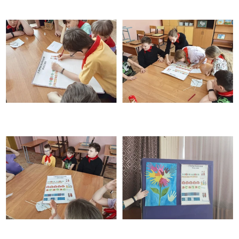 Старшеклассники трудились над плакатом «Узоры народов России». На ватмане появились русские цветы, татарские геометрические узоры, дагестанские звёзды — каждый узор рассказывал о культуре и традициях одного из народов нашей страны.